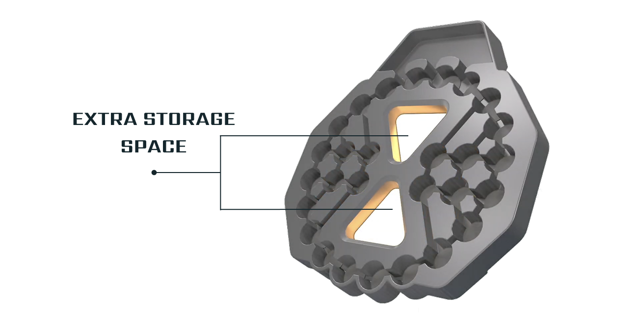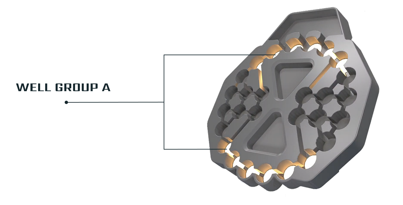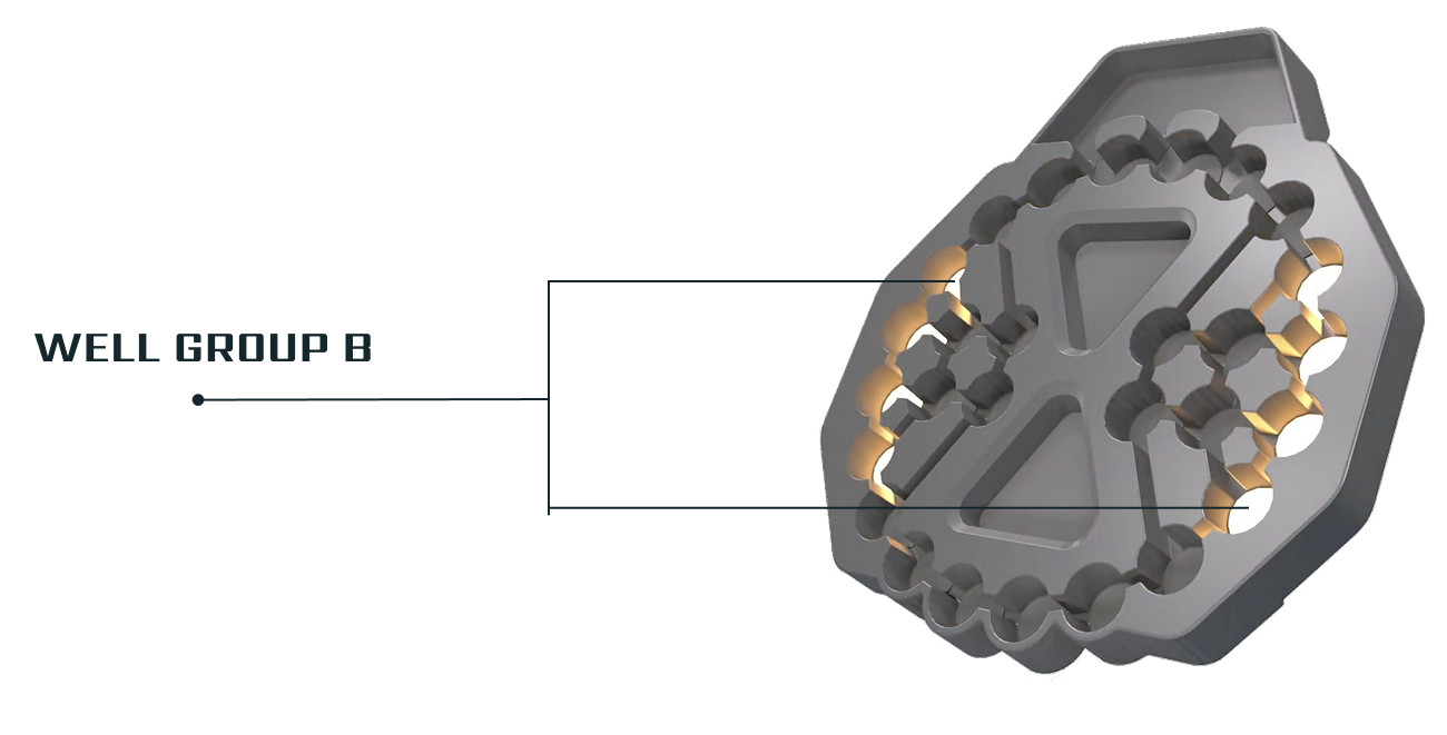 trays midway.A patented design for smart liquid distribution, the CBI Tray features a mouthwash-compatible flow system that enhances clinical efficiency. Mouthwash can be poured directly into the tray’s central basin, where a precision-angled surface guides the liquid evenly into multiple surrounding wells. When a tool or accessory is placed into a well, the tray’s buffer action technology prevents overflow by redirecting the displaced fluid back to the central reservoir. This ensures a clean, efficient use of the solution without spillage or waste. The result is an elegant, self-contained system for quick rinsing, soaking, or cleaning — all within the tray.